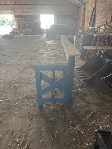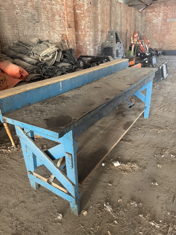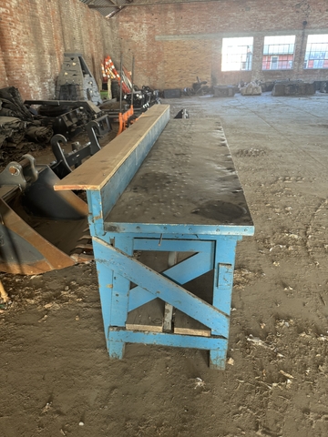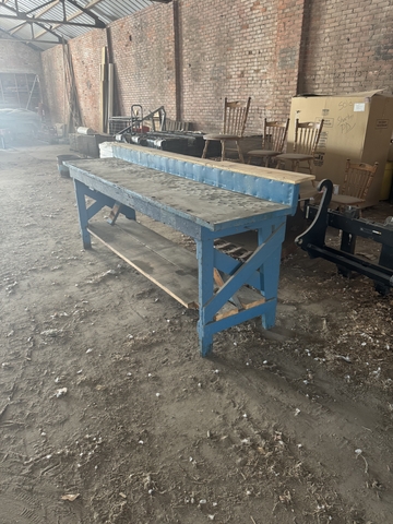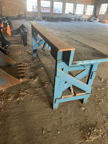 Older wood bench with metal work top. Roughly 9'long,36" top work surface,and30" wide. I can load for you.