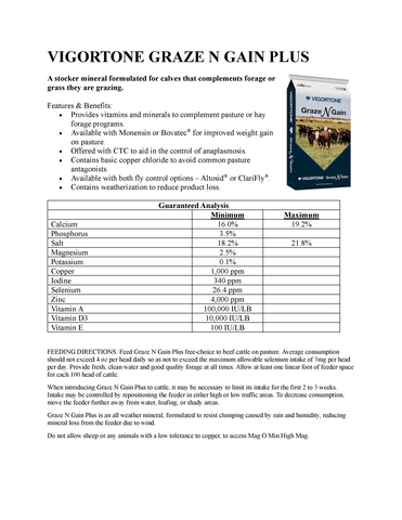 VIGORTONE GRAZE N GAIN PLUSA stocker mineral formulated for calves that complements forage or grass they are grazing with 2800 g/ton of CTC (chlortetracycline). VFD required.