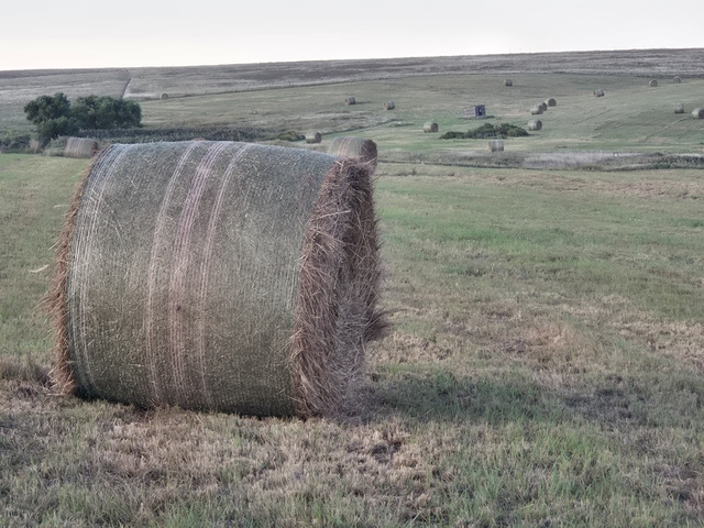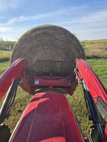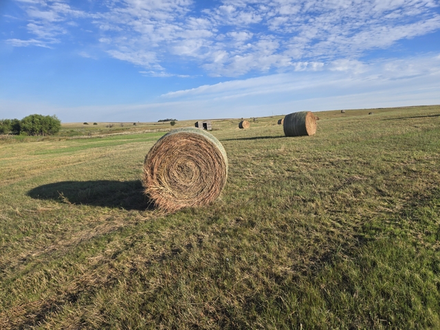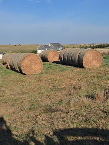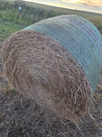 Big round bales, approximately 1200# (educated guess). Grass is a combination of CRP mix and brome. This year's cutting, and it was not raked after swathing, and the land was also put up for hay two years ago, so there's not as much trash as most CRP hay.