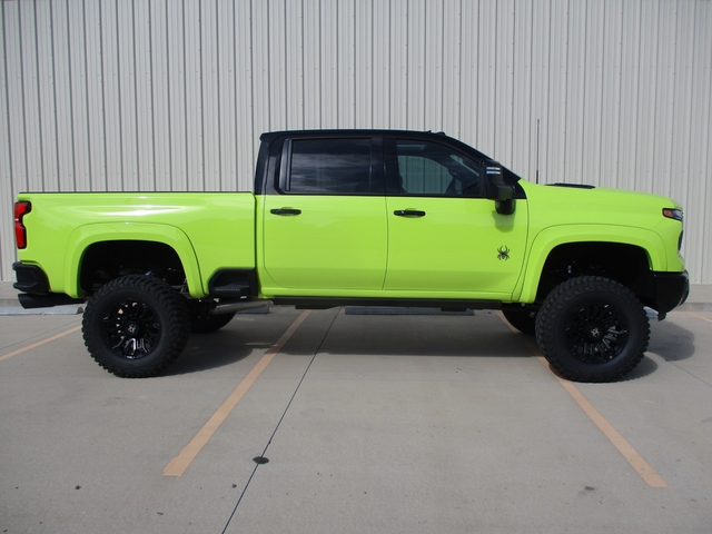 2025 Chevy Silverado 2500 LTZ 4x4, Black Widow Edition, 7" suspension lift, 20" wheels on 37" tires, short bed, 6.6 Duramax, 10 speed automatic transmission, autotrac 2-speed transfer case, custom leather interior, red LED interior lights, max trailering package 3500 HD frame, 3500 HD springs, adaptive cruise control, front & rear park assist, trailer side blind zone alert, rear cross traffic alert, HD surround vision, heads up display, rear camera mirror, sunroof, power running boards, heated & cooled seats, 15" heads up display, wireless charging, Bose premium sound, bed view camera, second row heated seats, rear sliding power window, universal home remote, adaptive cruise control, skid plates, HD air filter, spray in bed liner, all weather floor liners, all terrain tires, trailer tire monitoring system, HD trailering package, 20" sterling silver wheels wheels, power running boards, Shock/Jet Black exterior, jet black heated and cooled leather. MSRP $116.429
