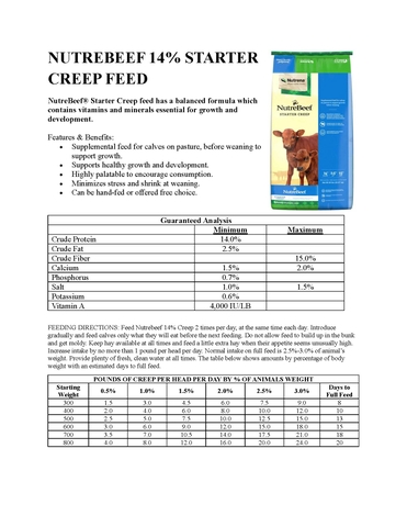 FEEDING DIRECTIONS: Feed Nutrebeef 14% Creep 2 times per day, at the same time each day. Introduce gradually and feed calves only what they will eat before the next feeding. Do not allow feed to build up in the bunk and get moldy. Keep hay available at all times and feed a little extra hay when their appetite seems unusually high. Increase intake by no more than 1 pound per head per day. Normal intake on full feed is 2.5%-3.0% of animal’s weight. Provide plenty of fresh, clean water at all times. See the table in the lable/instructions image above for feed amounts and days to full feed.