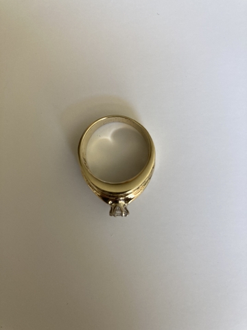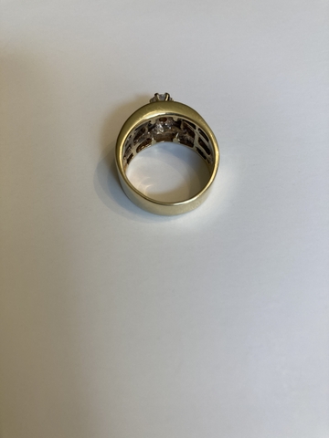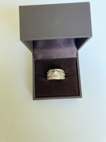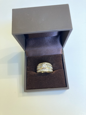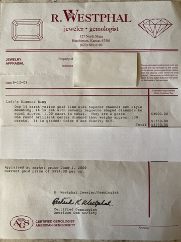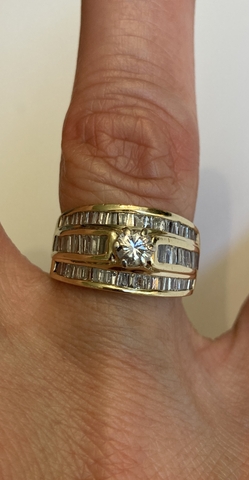 Solid 14k yellow gold ring with round center stone and 70 baguette diamonds to equal 1.00 carat total. They are A grade. Round brilliant center Diamond weighs approx .39 carats. It is graded Color H and Clarity SI2. Size 6.5. Ring appraised for $4,350 in 2009 when gold price was 1/3 it is now. Asking $1,800 obo.