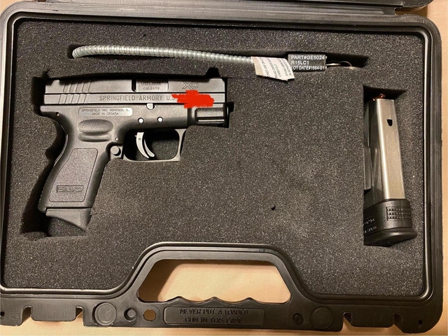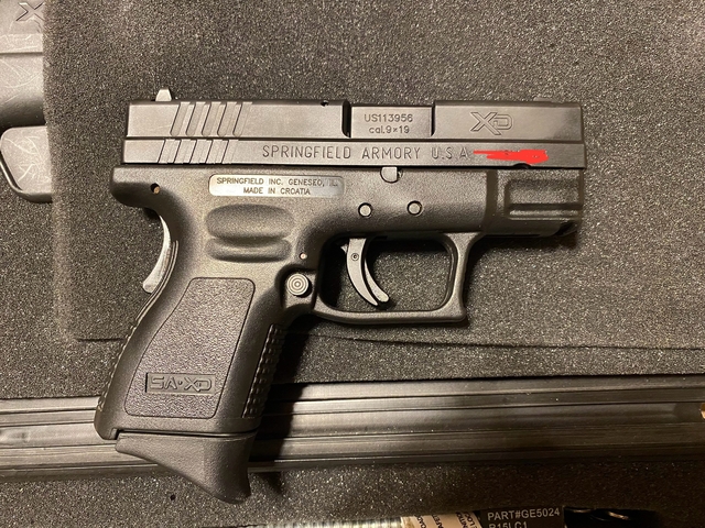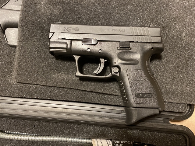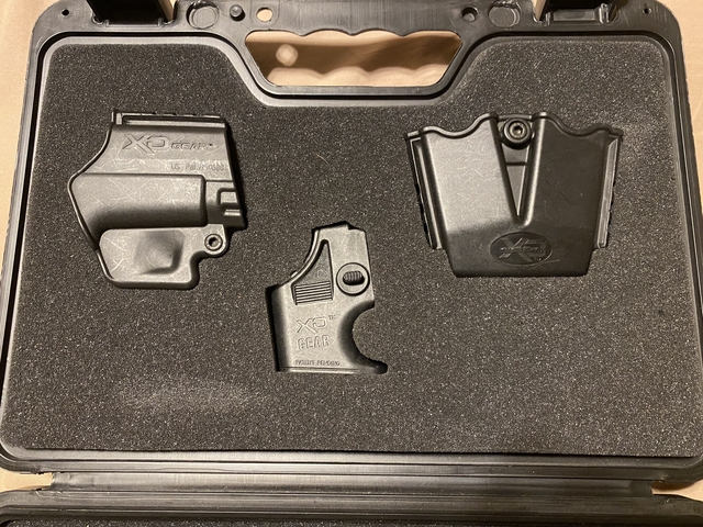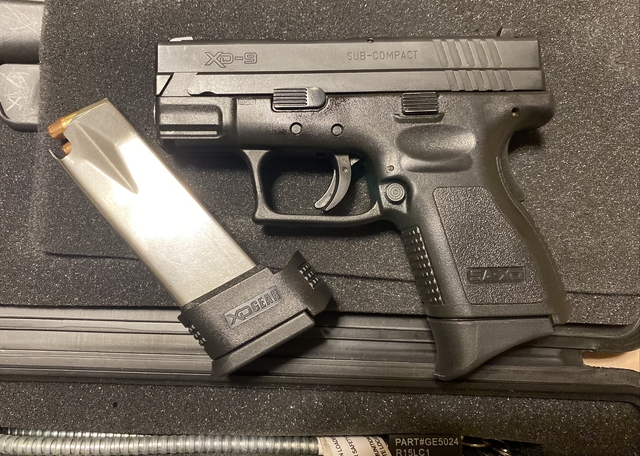 Springfield XD 9mm subcompact (3" barrel) with case, XD gear (holster, speed loader, magazine holder), 2 magazines (13 and 16 round) with Pearce pinky grip extension on the 13 round magazine.