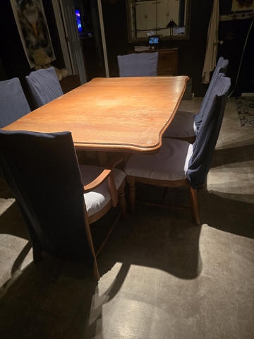 Moving sale downsizing, Solid wood dining room table and 6 chairs for sale 5'5" with no leafs plus 2,- 2' leafs. 500.00. Dollars cash you pick up. In Ellis, ks text if interested. 925/303/0970