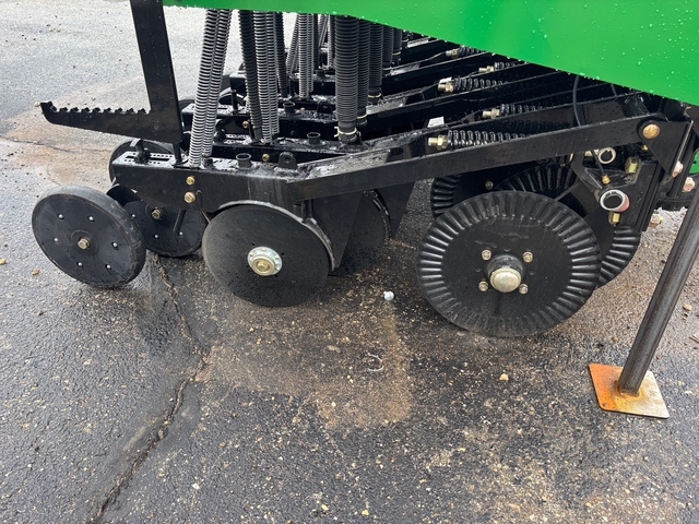 3PT mount with small seeds attachment. 7.5" spacing, 2x13 press wheels, 5/16 fluted coulters.