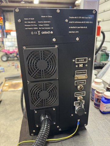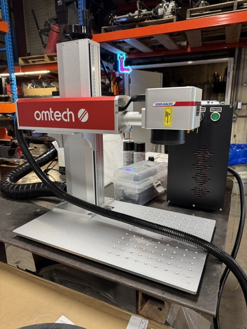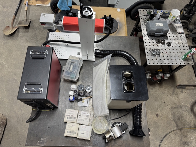OMTECH 60W Split Fiber Laser Marking Engraving Machine. Also comes with an 80mm Rotary 3 Jaw Axis, Fume Extractor, extra lenses (160mm, 210mm, 290mm, and (2) 254mm)