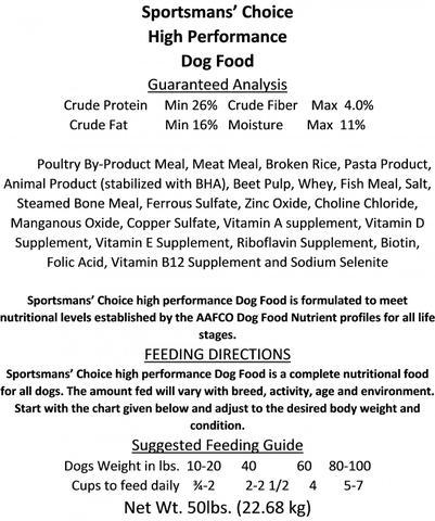 Hunters Blend Sportsmans’ Choice Dog Food is a quality meat based food. Formulated to meet nutritional levels established by the AAFCO Dog Food Nutrient Profiles for all life stages. Sportsmans’ Choice Dog Food, a balanced & complete nutritional food for all dogs. The amount fed will vary with breed, activity, age and environment. Start with the tags given below to determine which protein level best fits your dog’s lifestyle.