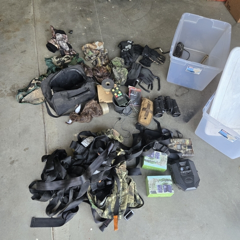 2 tree stands and 4 trail cams with extra gear. Text 785 452 one zero three two