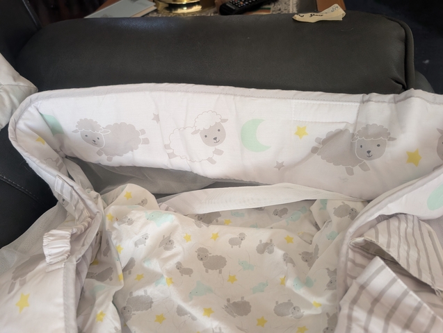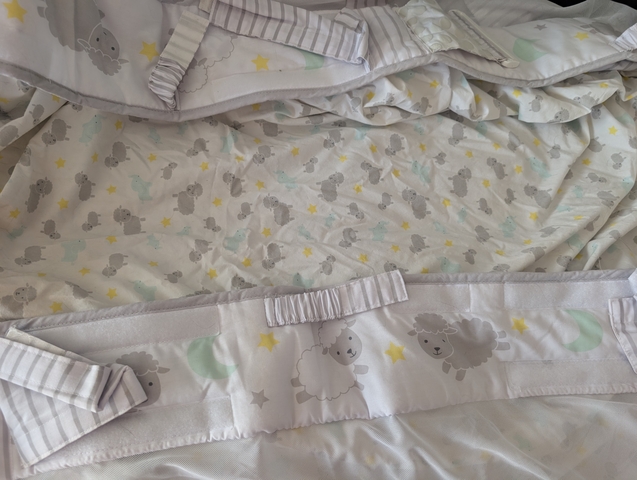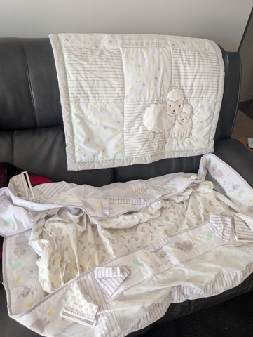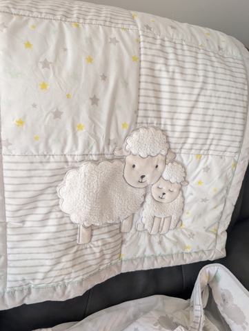 Adorable lamb-themed crib bedding set includes blanket, fitted sheet, and crib liner. Brand new, never used.