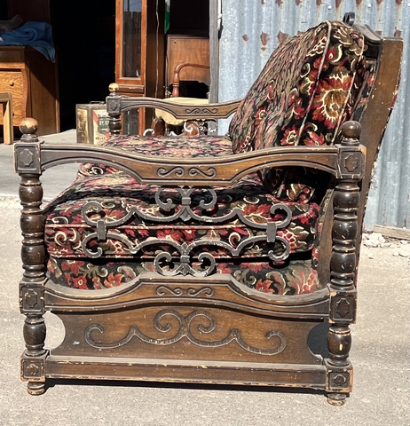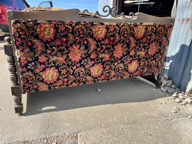 Beautiful carved wood frame and floral velvet upholstery. Fair condition – needs some TLC but solid bones. Great for restoration or vintage décor.