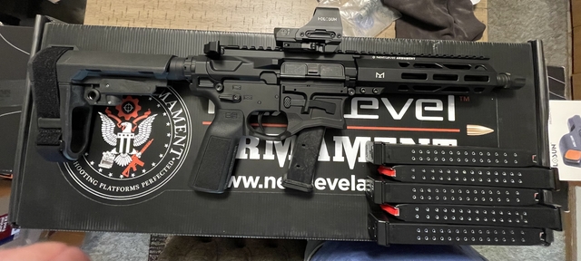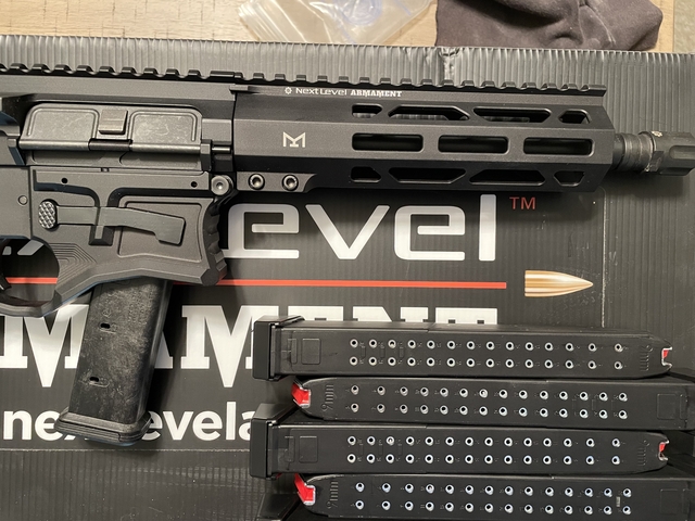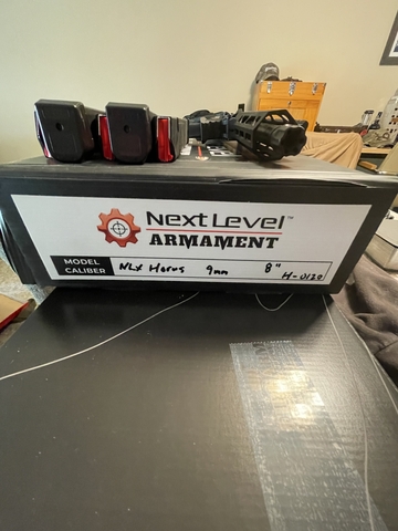 Next Level Armament NLX Horus 9mm PCC, AR-9, with 8" barrel and adjustable arm brace. Comes with 1-21rd mag and 5-31rd mags(uses Glock pattern magazine) I have a Holosun HE510C-GR that has been sighted on it. I will sell it with or without. Asking $1100 w/o optic, $1300 w/ optic. Call or text 361-648-7544 with any questions.