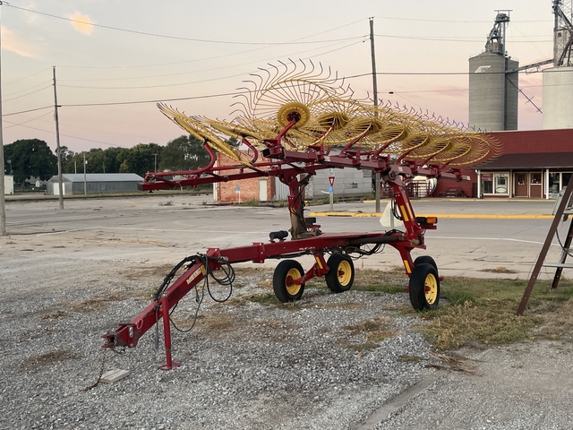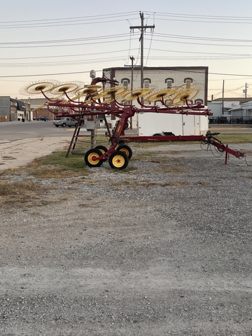 14 wheel rake with hydralic raise/lower, angulation and extension. Uses 2 hydralics with switch box. Indepedent wheel suspension with walking tandems. Sat inside in the winter, and have owned since new. More pictures available upon request.