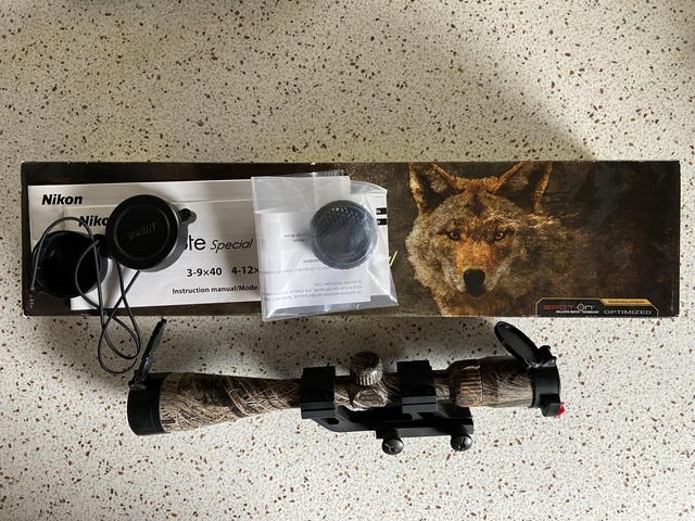 Nikon Coyote Special riflescope. Used. 4-12 power. 40 mm objective lens. BDC predator reticle. 1/4 moa adjustments. Comes with Rock River Arms one piece cantilever mount. Leveled and ready to install on any rail. Also included Bulter Creek flip up lens covers. Comes with original box, manuals and miscellaneous items that came with it new.