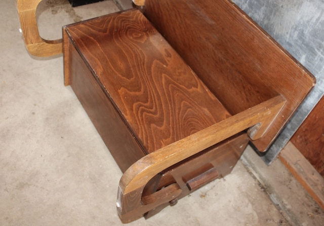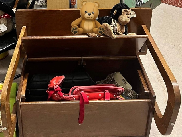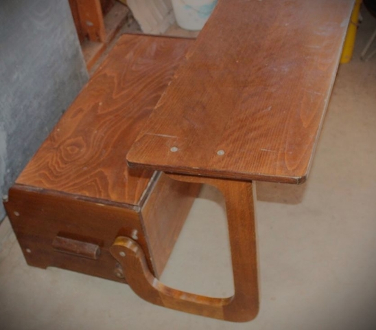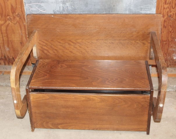 Charming mid-century wooden toy box that doubles as a child's desk! The lid flips up for roomy toy storage and folds down into a sturdy writing or play surface. Solid wood construction with warm finish and curved side supports. Great for a kid's room, or play area.