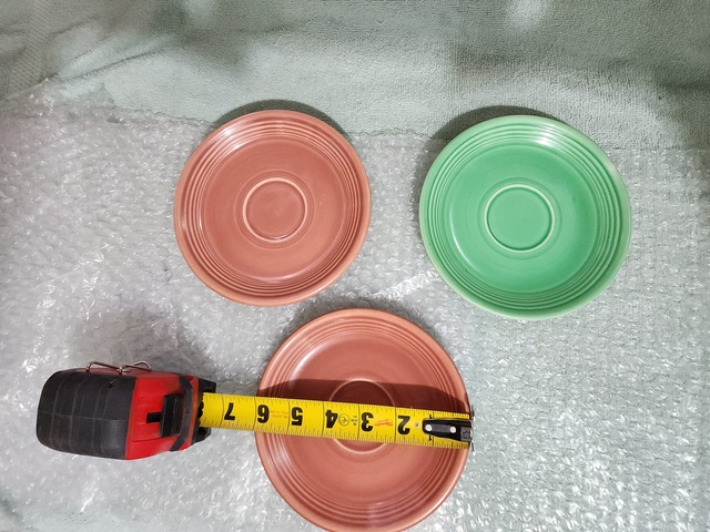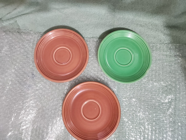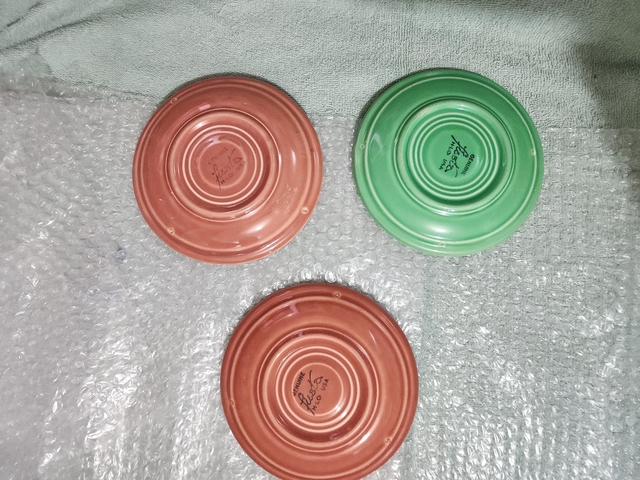 6 inch Vintage Fiesta plates (note the sagger pin marks on the reverse) 2 rose and 1 light green. $10 each