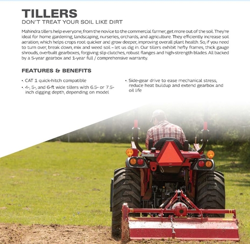 Mahindra tillers help everyone, from the novice to the commercial farmer, get more out of the soil. They're ideal for home gardening, landscaping, nurseries, orchards, and agriculture. They efficiently increase soil aeration, which helps crops root quicker and grow deeper, improvoing overall plant health. So, if you need to turn over, break down, mix and weed soil - let us dig in. Our tillers exhibit hefty frames, thick gauge, shrouds, overbuilt gearboxes, forgviing slip clutches, robust flanges and high strength blades. All backed by a 5-year gearbox and 1-year full/comprehensive warranty.