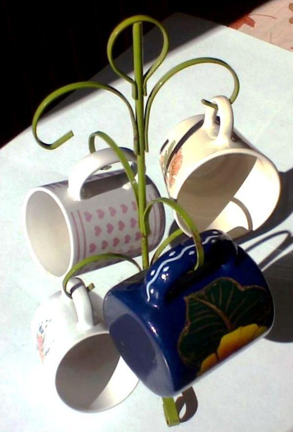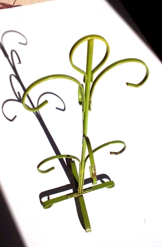 Rare find vintage wrought iron coffee mug trees/tea cup stands from the 1960s. The black four arm cup holder is 11” tall x 6½” wide at base. Green six arm 14½” tall x 6”, $5.00 each. These also work great to hang and display necklaces, jewelry and watches. https://4sale-site.weebly.com