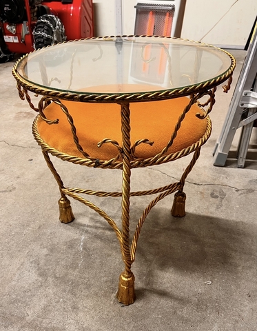 Have an Exceptional Antique Italian Gilt Metal Three-Leg Tole & Tassel Round Accent Glass Top End Table. This is a Hollywood Regency Gilt Tole Rope & Tassel Metal Three-Leg Table W/Round Glass Top W/Gold Velvet Upholstered Cushion, made around 1920s!! Attached to one leg is a metal tag that reads “MADE IN ITALY”. Measures 20” Tall, 17.5” Diameter. (NO HOLDS)(No Deliveries)(CASH ONLY) LOCATED IN HAYS, KS (REDUCED)