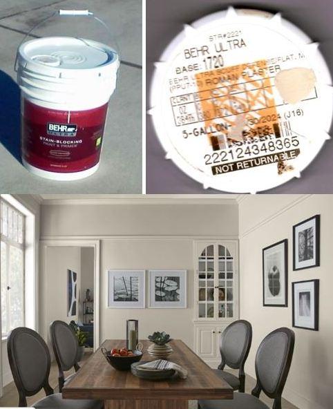 2 ½ gallons of Behr Ultra Scuff Defense Interior Flat Paint - $30.00 The color is called Roman Plaster & it is a warm tone beige/tan color reminiscent of ancient Roman sculptures. The 5 gallon bucket is over half full.