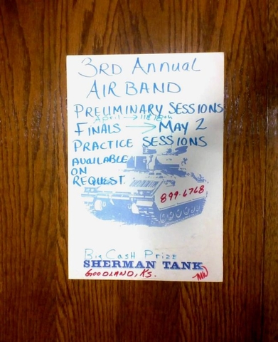 Poster from the 3rd Annual Air Band Finals from May 2, 1984 at the Sherman Tank – Goodland, KS. The Sherman Tank was a live music venue and bar in Goodland, KS that featured many local and top bands, rock & roll groups and air bands during the 80s and 90s. 11” x 17”