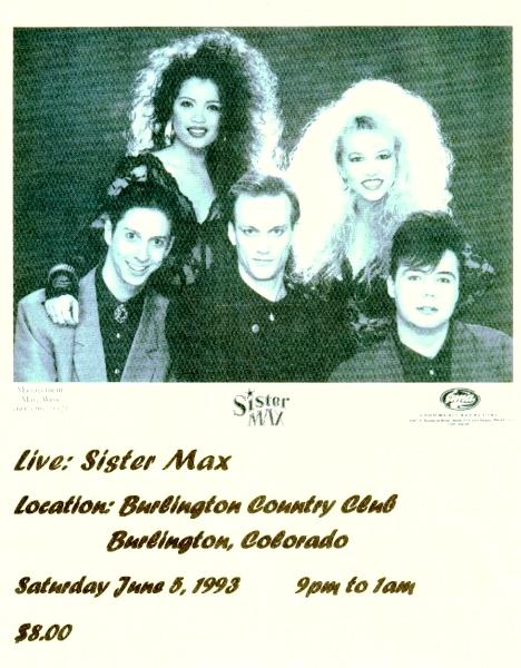 Sister Max – Burlington Country Club, Burlington, Colorado – Saturday June 9, 1993 Pop /Top 40 cover band that played some of their own original songs. Based out of Denver, Colorado. Performed for several years (1992-1994) in various states in the Western United States. 8½” x 11”
