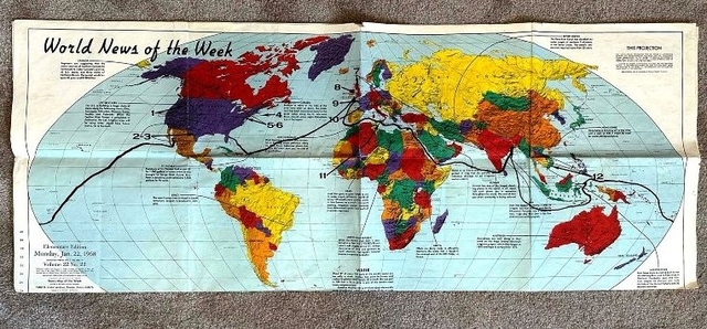 1968 World Map - $25.00 News Map of the week for January 11 to January 17, 1968. 57 years ago. Full Color map measures 47” wide x 19” tall. The map features 16 notable “News Worthy Facts & Stories” that were in the news the week of January 11th to 17th 1968. The other section features 12 news stories and current event information going on that pertains to that month of January 1968. The overall measurements of the map and news story sections is 47” wide x 38” tall” It shows all the various country borders as of 1968 – which some are not the same as today in 2025. Interesting stories about the work on Apollo and photos of the Manned Space Craft Center in Houston. It also mentions that the Green Bay Packers beat the Oakland Raiders (33-14) in the Super Bowl on January 14, 1968. This map is suitable for framing.
