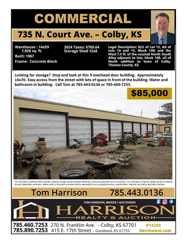 Looking for storage? Stop and look at this 9 overhead door building. Approximately 16x70. Easy access from the street with lots of space in front of the building. Water and bathroom in building. Call Tom at 785-443-0136 or 785-460-7253