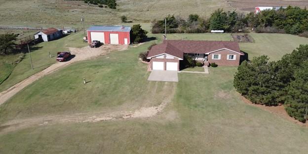 This property provides a beautiful view and excellent access to Hwy 281. The ranch-style residence, a wood-frame home with brick exterior, was built in 1976 and has been well maintained by the original owner. This property will provide a family with the opportunity to enjoy rural residential ownership while also having the flexibility to have some livestock. The dwelling contains 1,835 sq. ft. on the main level with a full basement that is approximately 75% finished. The main floor includes a kitchen with eat-in dining, formal dining room, living room, family room, three bedrooms, and two full bathrooms. The basement features a cozy family room with bar area perfect for entertaining friends, family and guests. Enjoy two functioning fireplaces with 1 on the main level and a 2nd in the basement. Along with the property comes several excellent supporting structures, which include a 38' x 40' insulated and heated metal-frame shop with concrete floor and overhead doors, a 40' x 60' metal-frame shop with large overhead door and dirt floor, several grain bins, and small animal sheds. A 1.2-acre fenced corral with water is available for small livestock or 4-H/FFA projects. Purchase Tract 2 as well to have that perfect rural residential life. Possession of Tract 1 will be granted at closing. Possession of Tract 2 will be subject to existing tenancy rights.