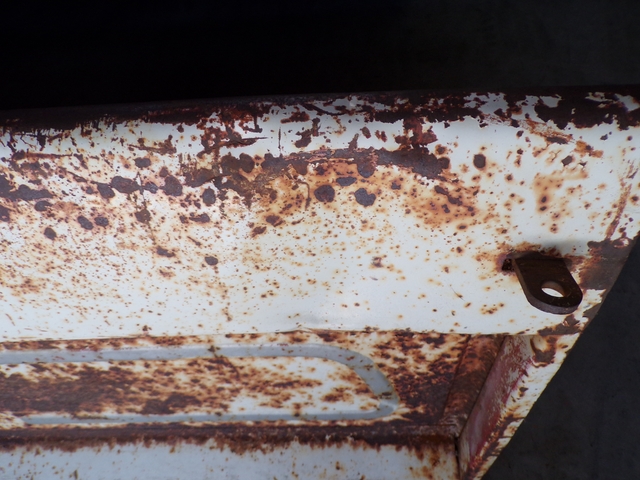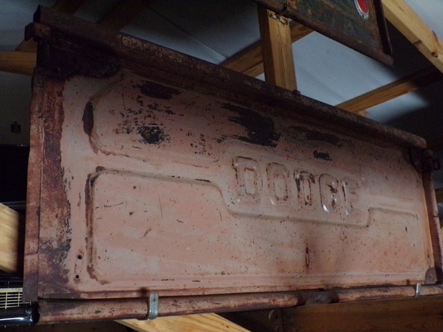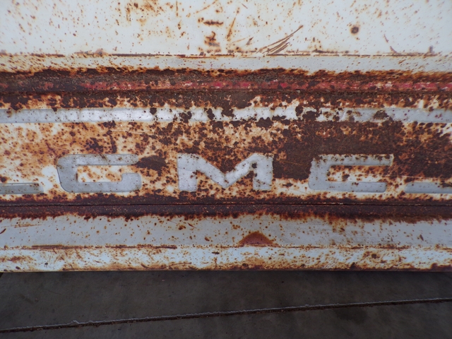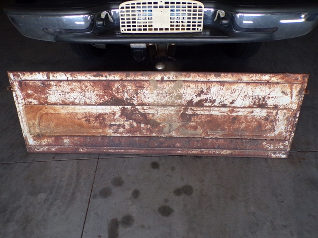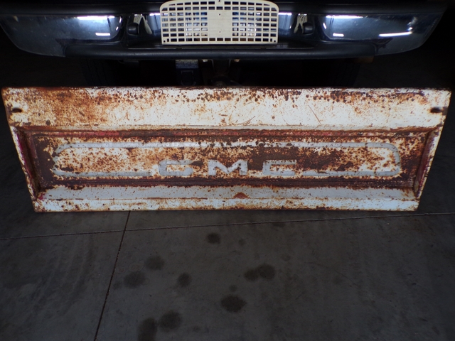 Old 1960s GMC tailgate. Has surface rust but is solid with no rust through - not any pinholes. Has some dings / dents. May trade for old Dodge tailgate similar to last photo. Call 6206176644 - emails & texts are usually ignored as a scam.