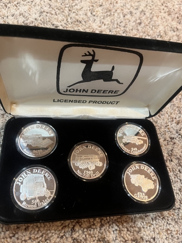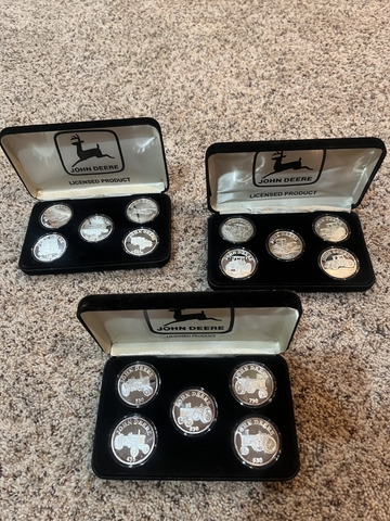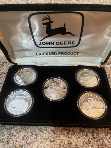I have three sets of five coins each, John Deere commemorative silver rounds 1oz each in casesCoins are in excellent shape.