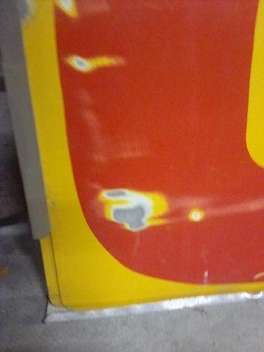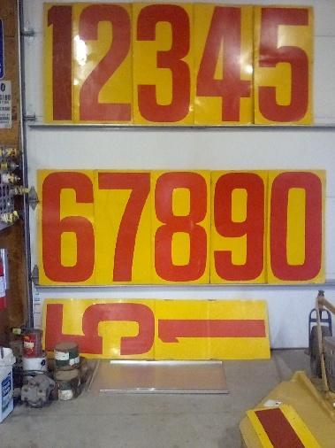 For sale used gas price numbers used at gas stations before they went to electronic price signs. I have been told that the yellow background with red numbers designates them as Shell Oil number signs. 13 number signs total. Signs measure 18in wide x 36in tall. 11 of them are aluminum and double sided (with a different number on the reverse side). 2 of them are steel (the number 1) and are single sided. A few of them have a few scratches on them. First responses to the ad get first choices. $25 CASH each, buy the entire bunch for $250. Aluminum rack to hold the numbers will be included with the bunch. Located in Tribune, KS. 67879. Message me for my cell number. (I will be away from the computer this weekend but will respond ASAP. Be patient.)