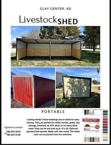 LOAFING SHEDS! If you are interested in a building let Carter Long 785-447-3️⃣5️⃣1️⃣5️⃣or Weston Hammond 785-447-3️⃣1️⃣4️⃣5️⃣know. Buildings are on skids for easy moving. Perfect for cattle, horses, goats, hay storage, firewood, atv shed,golf carts or so many other uses! Can make any size up to 10 x 30 and you chose your colors!! Optional plywood kick boards. Gates Availbale as well. Made with new metal!