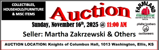 AUCTION LOCATION: Knights of Columbus Hall, 1013 Washington, Ellis, KS
