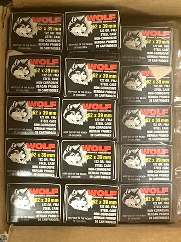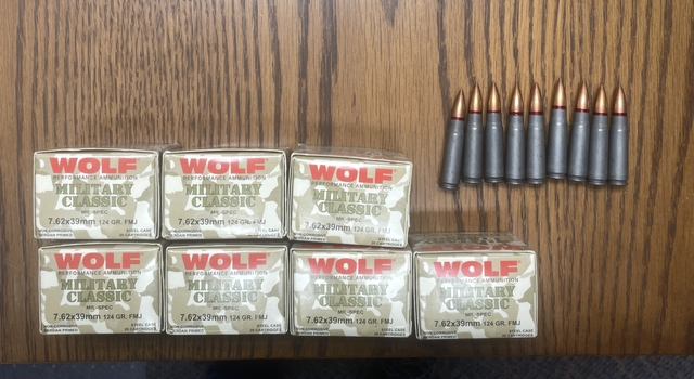 WE HAVE 559 ROUNDS OF 7.62 X 39 WOLF PERFORMANCE AMMO.THERE ARE 159 ROUNDS OF MILITARY CLASSIC MIL-SPEC 124 GR. FMJ AND 400 ROUNDS OF PERFORMANCE 122 GR. FMJ ALL IN STEEL CASE.
