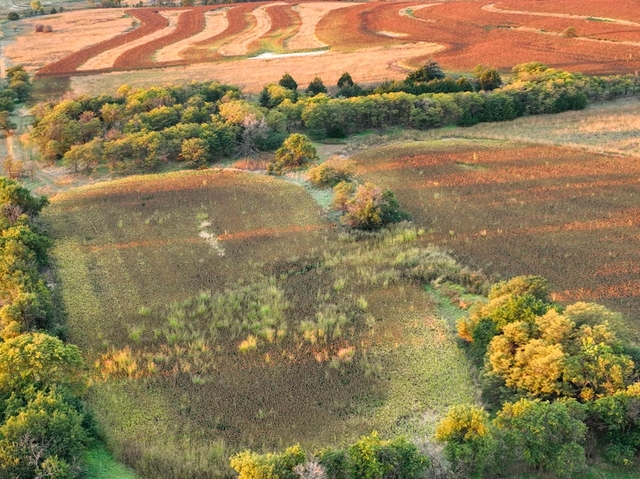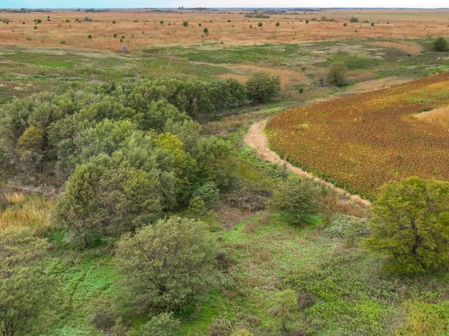 In the northeast corner, a 5-acre block of timber creates a terrific main hunting setup, consisting of a mix of tall native grasses, cedars, hardwoods, and thick brush, with large hedge trees lining the roadways to provide ideal edges for scrape lines. Along the eastern boundary, 10-12 foot tall cane and grass stand as a natural privacy screen, blocking views into the farm. Over 38 acres of productive tillable land are currently planted with a high-yielding milo crop, complemented by 13+ acres of CRP grasslands occupying terrace channels and draws, creating excellent habitat diversity. The south end features another stretch of tall trees surrounded by native grass, with numerous deer trails clearly visible in aerial drone images. Upland bird hunters will be satisfied with the quail and pheasant numbers in this area, as evidenced by the quail and pheasants observed and heard on the property recently.