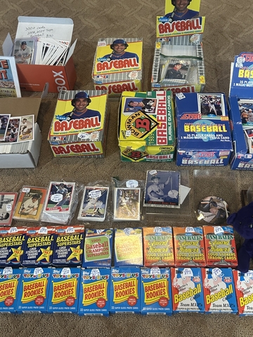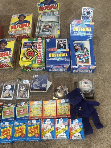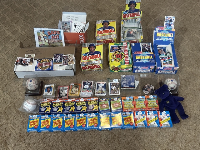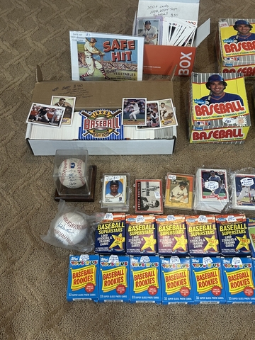 Wax boxes have been opened all big star players are in penny sleeves and in great condition and cards have been put back into the boxes. Mickey mantel large card. Printed autograph baseballs. Mark McGwire bear, 1950's baseball vegetable crate label. All the boxes are full of cards. So much more not in this description .