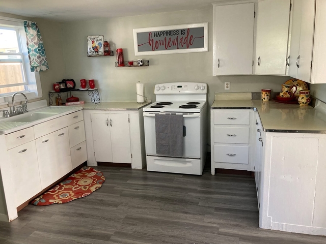 Charming 2-bedroom, 1-bath home great location with convenient walking distance to schools and medical care. This property features numerous updates interior and exterior! The fabulous curb appeal welcomes you to the property with the fresh exterior paint, metal roof and new windows. The living and dining area welcomes you with a light airy feel an abundance of space. The home consists of two bedrooms and a full bath. With approximately 810 sq. ft., it includes a generous kitchen with plenty of cabinets and countertop plus fantastic nostalgic sink, plus washer dryer hookups, and the kitchen provides access to the private backyard. Additional highlights include kitchen stove, window ac units, metal roof, fresh paint, a garden shed, workshop/garage shed, and off-street parking. Nestled on a sizable lot, this home offers fantastic private outdoor living.