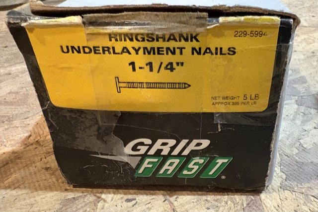 Ringshank Underlayment Nails: 5 pounds, 1-1/4" Box is a bit rough, but unused. New 1 pound box is $3.99, asking $15