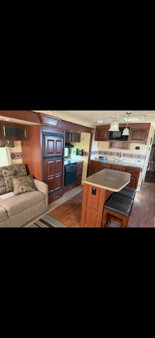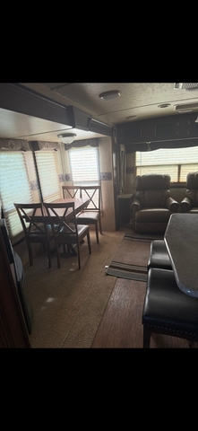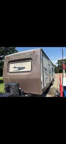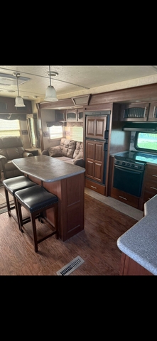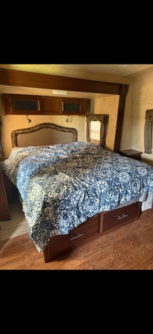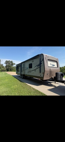 34ft. Queen size bed in the front. Couch makes out into a full size air mattress. Lots of storage inside. 3 slides, 2 awnings. Please feel free to message me with any questions!