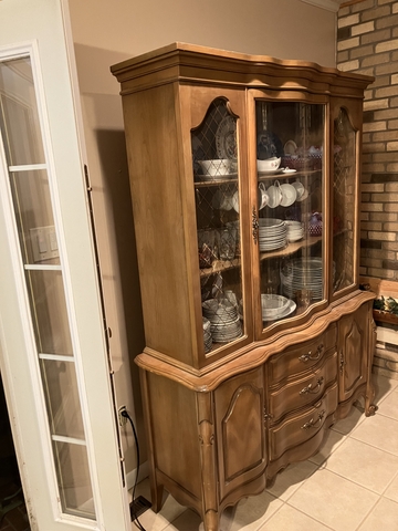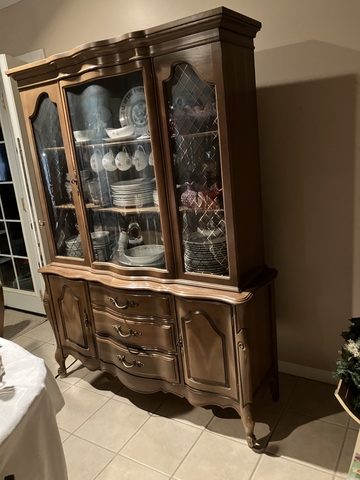NICE LOOKING CHINA HUTCH WITH DRAWERS BELOW FOR STORAGE, WOOD SHELVES, NOT LIGHTED INSIDE, MOST OF CHINA IS FOR SALE AS WELL. 4 FT 7 INCH WIDE , 6 FT 1 INCH TALL. MATCHING DINING TABLE WITH 3 LEAFS FOR SALE AS WELL IN ANOTHER AD