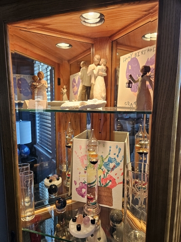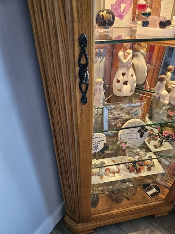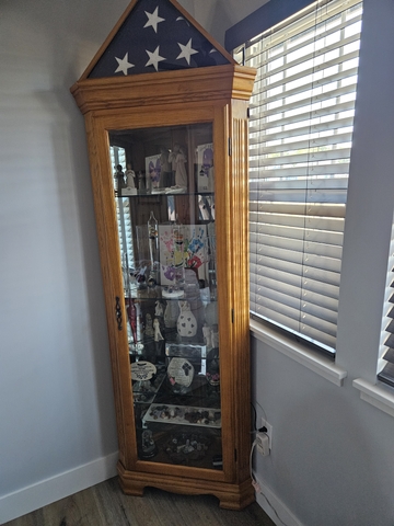 Solid wood, 5 adjustable glass shelves, and mirrored walls. 3 setting touch lighting. Sides measure about 13" width by about 26 " across, stands about 6 1/2 ft tall.