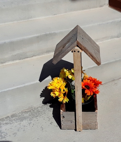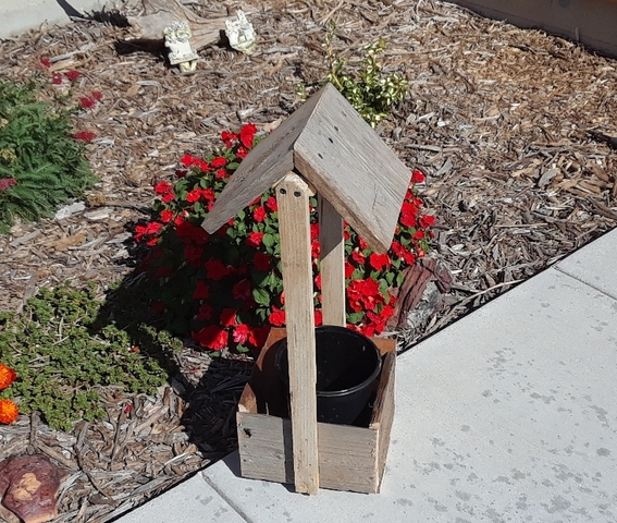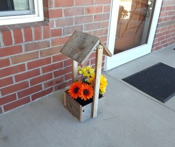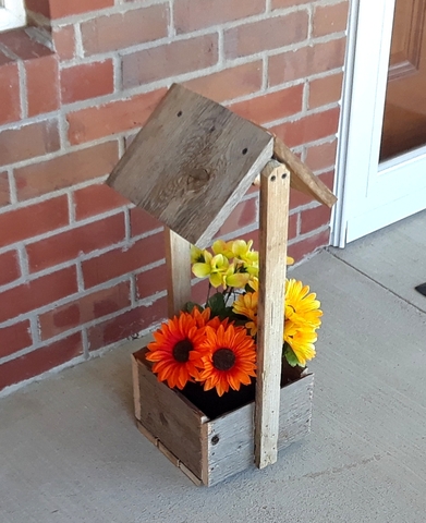 Porch Art Decor - $15.00 Selling a “Wishing Well” styled porch art décor made of old weathered barnwood with an 8½” x 8½” x 5” tall base that can hold a flower pot, fall pumpkin décor, pine cones, display of unique rocks, knick knacks items or artificial flowers (not included). Overall dimensions 22” tall. Ideal “rough wood” look to decorate your porch, garden area or back yard.