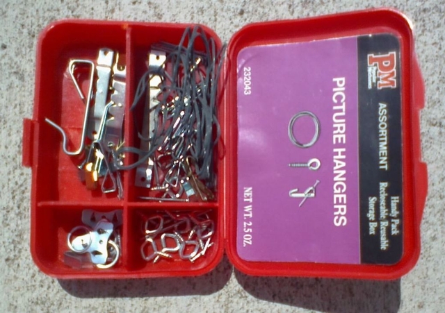 Picture Hanging Kit - $5.00 50 piece handy pack assortment of picture hangers. Brand: Popular Mechanics. Includes a variety of small nails, brads, hooks and fasteners to hang pictures and wall décor pieces.