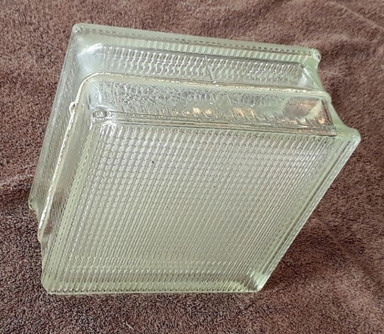 Glass Square Block - $8.00 Selling one (1) multi-use square glass block/brick with a abstract checkered board pattern texture. Dimensions: 7¾” x 7¾” x 4” Indoor or outdoor décor, craft and hobby uses and can be used to create a decorative light.