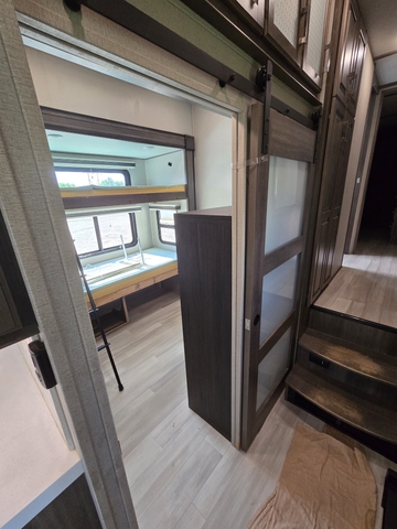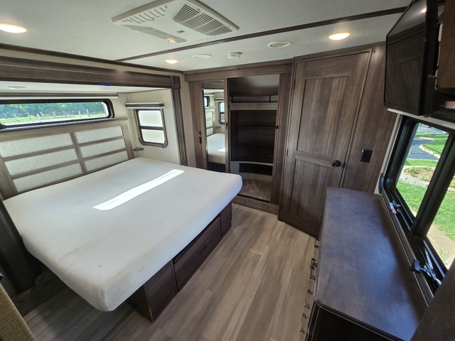 4 spacious slide-outs for tons of room inside. 2 bedrooms, one with king, one with bunk beds. Couch with fold out bed.