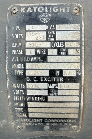 Katolight 10kW generator in good condition, ideal for industrial, agricultural, or backup power applications. Built in the USA by Katolight Corporation (Mankato, MN), known for durable and dependable power systems.