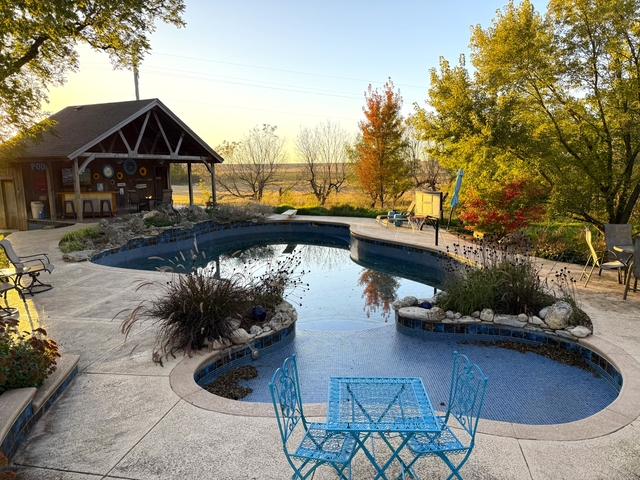 Outside, relax in the custom McKee pool or unwind on the deck while watching breathtaking sunsets. A pool house and firepit make outdoor entertaining effortless. Mature trees surround the property, offering natural beauty and privacy. A deep two-stall attached garage provides easy access to the kitchen for groceries. As you head east toward the barn, you’ll pass raised garden beds and a horse round pen. The 30’x70’ barn features a concrete floor with a 12’ overhead door in front, while the back includes a dirt floor area with rubber-matted pens and an automatic waterer—perfect for horses or livestock. Two fenced pastures complete this ideal setup for country living.