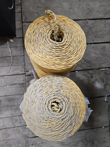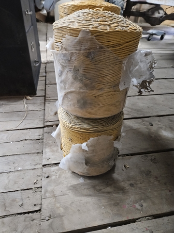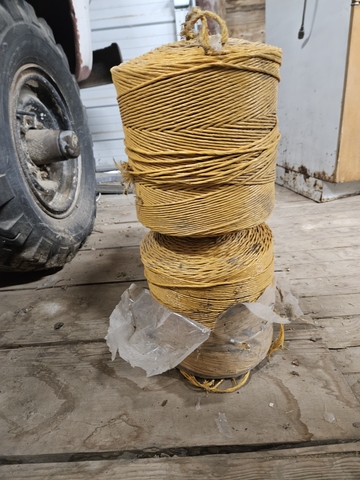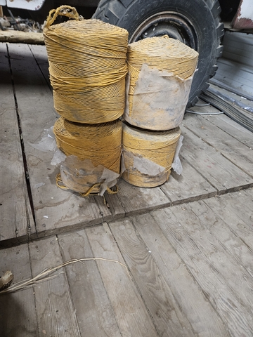 Dusty from sitting in barn. Yellow twine. Not sure on specifics. The clear plastic packaging is not intact. Some of the ends are frayed, but the rest of the twine appears strong and undamaged. $25 for all