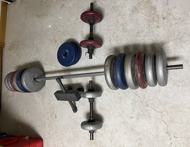 Includes ab roller, hand grip strengtheners, and these weights:4.4 lb x 25 lb x 28.8 lb x 610 lb x 214.8 lb x 6You pickup in country at home north of Hays. Call or text Dave at 785-259-6522 if interested.