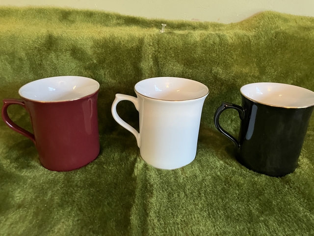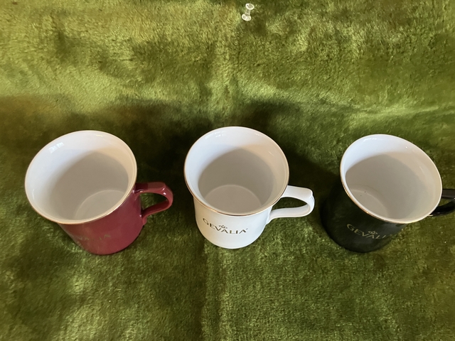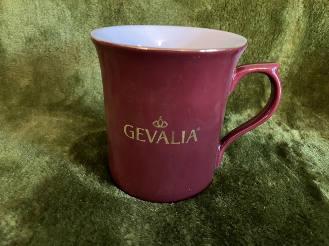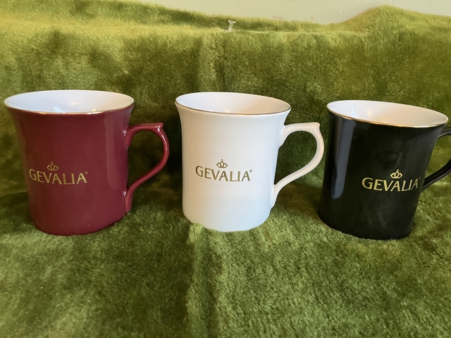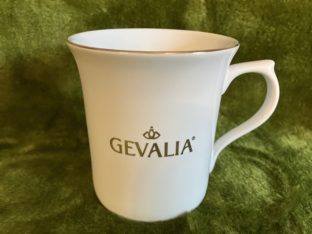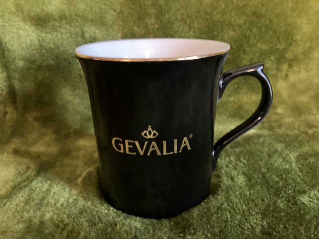 These vintage Gevalia Kaffe coffee mugs from the1990's feature a contemporary design with a gold trim on the rim and handle, making it a stylish and functional addition to any kitchen or home collection. Suitable for hot beverages, this medium-sized round mug is made of ceramic and porcelain, with a handle for easy carrying.